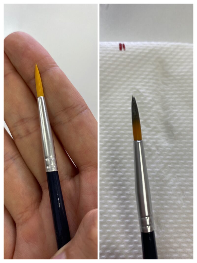 色を塗るときには「ミニチュアに穂先を置いて伸ばす」と思うんですが、引っ張ったときに毛先が