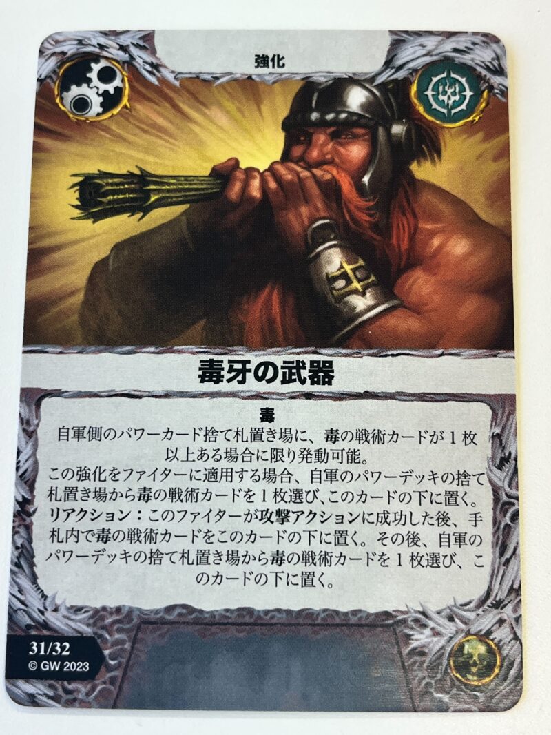 あなたがこの強化カードをファイターに与えるとき、あなたのパワーカード捨て札置き場から毒戦術カードを1枚まで選び、このカードの下に置く。リアクション:このファイターが攻撃アクションに成功した後、このカードの下にある毒戦術カードをあなたの手札に加える。その後、あなたのパワーカード捨て札置き場から毒ガンビットを1枚まで選び、このカードの下に置く。